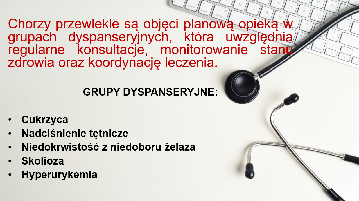 Poradnia Lekarza Rodzinnego Poradnia Alergologiczna Poradnia Angiologiczna Poradnia Chirurgiczna Poradnia Chorób Naczyń Poradnia Dermatologiczna Poradnia Endokrynologiczna Poradnia Gastrologiczna Poradnia Geriatryczna Poradnia Ginekologiczna Poradnia Kardiologiczna Poradnia Medycyny Pracy Poradnia Nefrologiczna Poradnia Neurologiczna Poradnia Ortopedyczna Poradnia Otolaryngologiczna Poradnia Proktologiczna Poradnia Reumatologiczna Poradnia Zdrowia Psychicznego Gabinet Psychoterapii i Pomocy Psychologicznej Dzieci i Dorosłych Gabinet Zdrowego Żywienia Opieka Pielęgniarska Opieka Położnej Pracownia USG